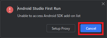 6. アドオン一覧の取得失敗のエラーが表示される。[Cancel]ボタンを押下する。