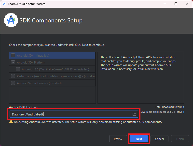 8. SDKのセットアップ画面が表示される。3で展開したAndroid SDKのパスを指定し[Next]ボタンを押下する。