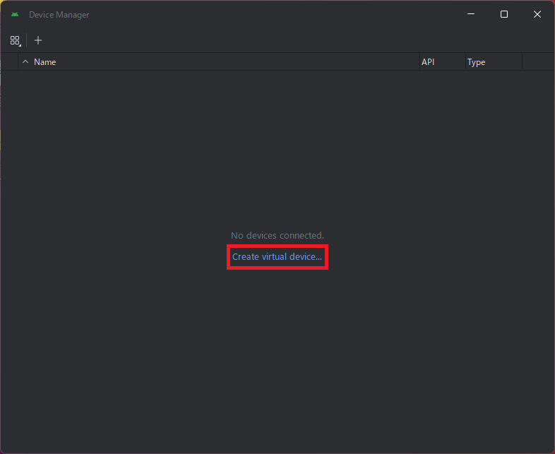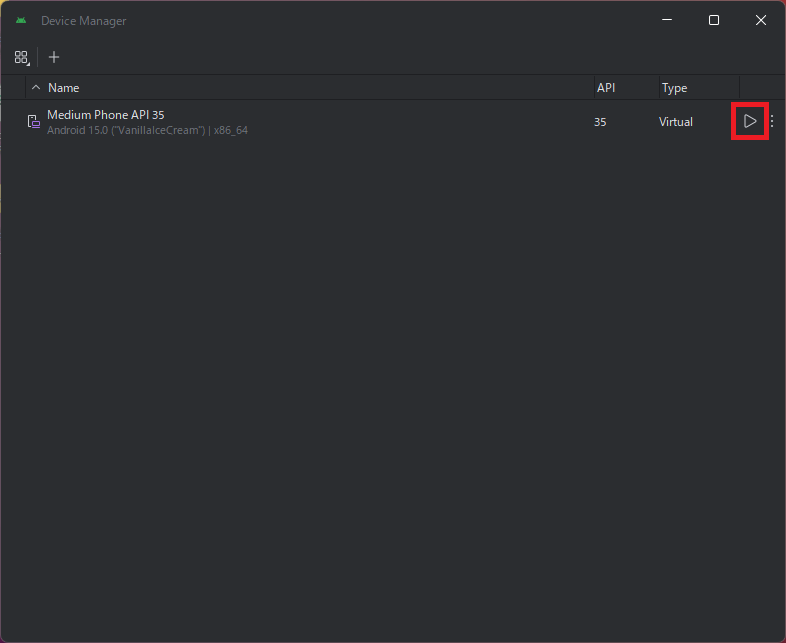 7. Device Manager画面に作成したエミュレータが追加された。[開始]ボタンを押下してエミュレータを起動してみる。