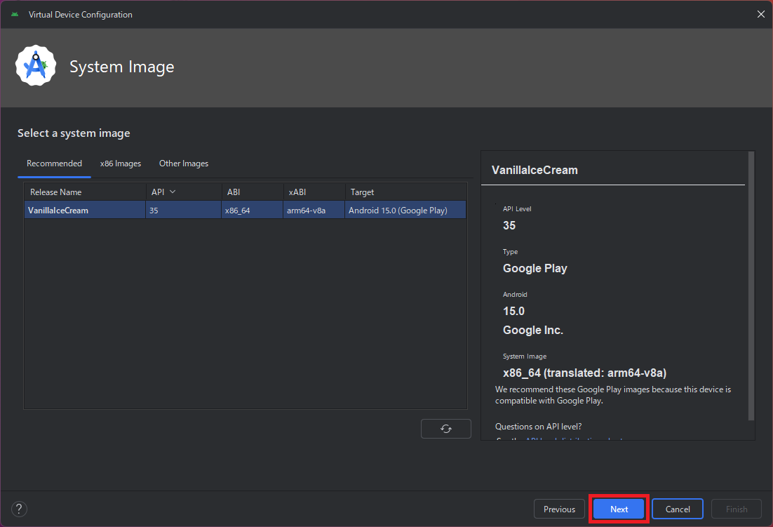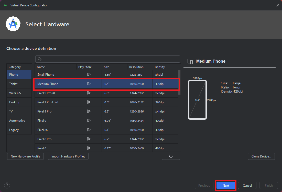 4. Virtua Device Configration画面で作成するAndroid エミュレータのタイプを選択し、[Next]ボタンを押下する。今回は「Medium Phone」を選択した。