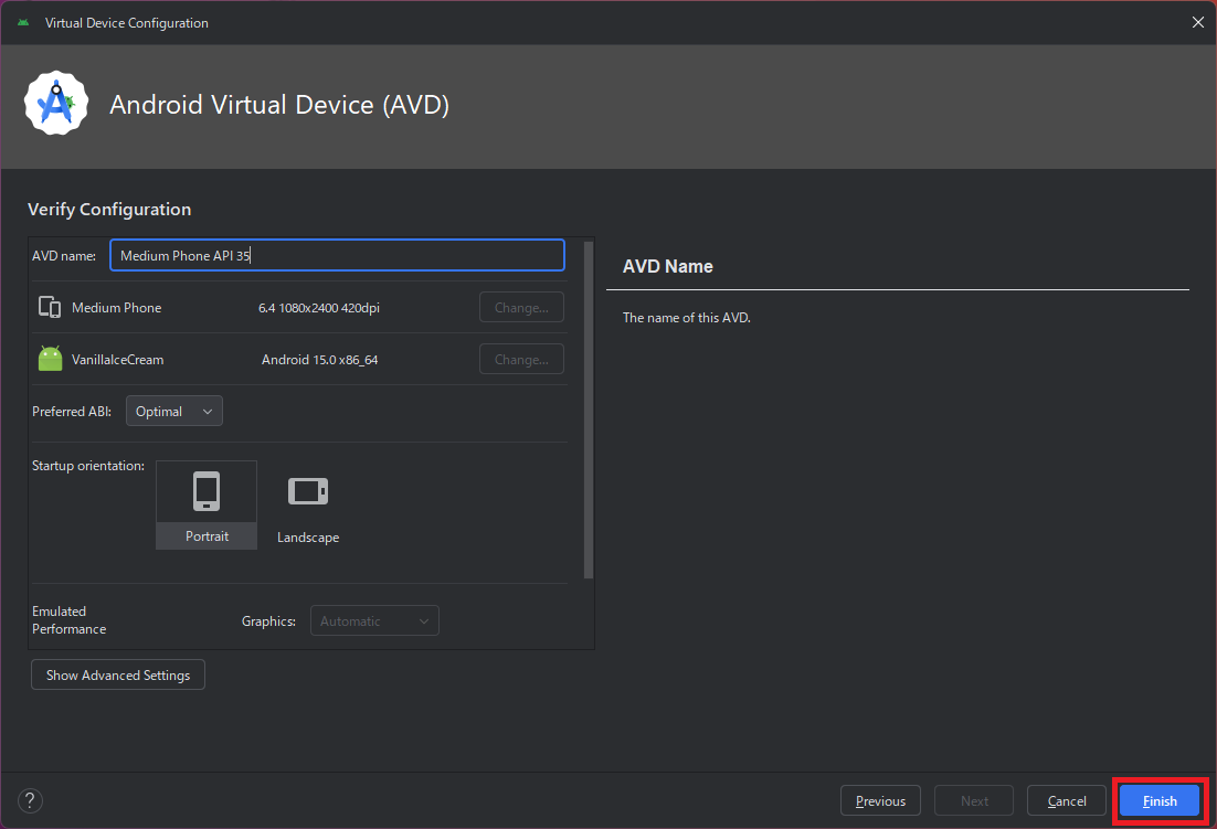 6. エミュレータの設定画面が表示される。特に変更する必要が無かったのでそのまま[Finish]ボタンを押下した。